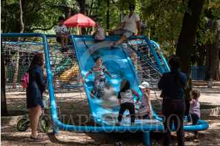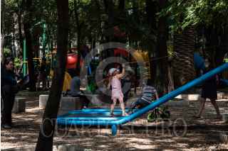 CIUDAD DE MÉXICO, 27JUNIO2020.- Padres acompañan a sus hijos en la zona de juegos del Parque México, pese a que el semáforo naranja epidemiológico por covid-19 en el país se activará el próximo lunes. FOTO: MARIO JASSO /CUARTOSCURO.COM