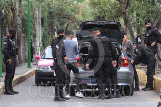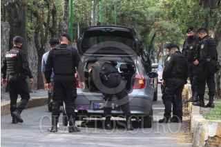 CIUDAD DE MEXICO, 27JUNIO2020.- Policía de la ciudad mantiene el operativo de resguardo en la periferia del Hospital Médica Sur, donde se recupera el titular de la Secretaría de Seguridad Ciudadana, luego del ataque por un comando armado el pasado jueves. En imagen, policías capitalinos realizan revisión a un vehículo de la marca BMW en el que viajaban dos jóvenes, esto luego de que este pasara en repetidas ocasiones frente al nosocomio. FOTO: ROGELIO MORALES /CUARTOSCURO.COM