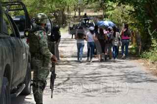 CHILPANCINGO, GUERRERO, 28JUNIO2020.- Miembros de la Guardia Nacional (GN), de la Policía Investigadora Ministerial (PIM) de la Fiscalía General del Estado (FGE), además de agentes de la Policía del estado y del municipio de Chilpancingo, desplegaron un operativo en la localidad de Mohoneras, luego de que se reportara una intensa balacera; la cual se dio entre integrantes de 2 grupos de policías comunitarios de la Unión de Pueblos y Organizaciones del Estado de Guerrero (UPOEG), mismos que operan en las localidades de Ocotito y de Mohoneras. Esto sobre la carretera vieja que conecta a esta localidad con el poblado de Julián Blanco y Tierra Colorada, logrando la detención de 2 personas, especulando que uno de estos era comandante de la policía comunitaria de Mohoneras, así como 2 vehículos que fueron decomisados. Una de las versiones indica, que la madrugada de este día fue secuestrado Roberto Parra, empresario de El Ocotito, dedicado a la venta de productos agropecuarios, así como al abastecimiento de pollo en el mercado de este poblado. FOTO: DASSAEV TÉLLEZ ADAME/CUARTOSCURO.COM
