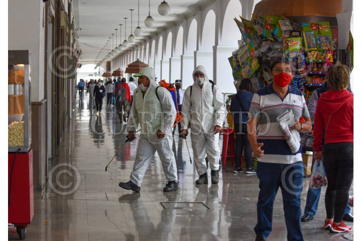 El Estado de México continúa en Semáforo Rojo por la contingencia por COVID-19, algunos espacios públicos como los Portales de Toluca ya comienzan a tener más afluencia de personas preparándose para el cambio a Semáforo Naranja, el uso de cubrebocas es esencial así como se continúan realizando trabajos de sanitizacion. FOTO: CRISANTA ESPINOSA AGUILAR /CUARTOSCURO.COM