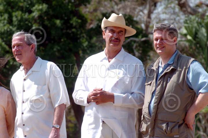 CHICHEN ITZA, YUCATAN 30MARZO2006. El presidente Vicente Fox, George W. Bush, presidente de los Estados Unidos de Norteamérica y Stephen Harper, primer ministro de Canadá, visitaron la zona arqueológica de Chichén-Itzá en el marco de la II Reunión de la Alianza para la Seguridad y la Prosperidad de América del Norte. FOTO: Gustavo Benitez/Presidencia/CUARTOSCURO.COM