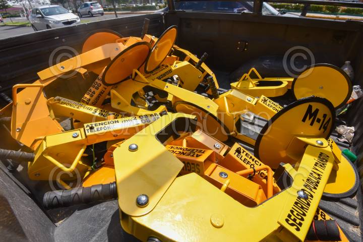 A partir de este día entró en vigor la aplicación de inmovilizadores vehiculares en Metepec, a los automovilistas que lo respeten señalamientos, se estacionen en lugares prohibidos, doble o tercera fila y rampas; elementos de seguridad de este municipio realizó recorridos por la zona de centros comerciales y vialidades primarias para comenzar a aplicar esta medida. FOTO: CRISANTA ESPINOSA AGUILAR /CUARTOSCURO.COM
