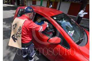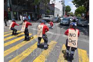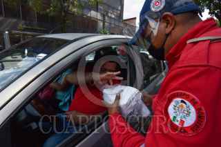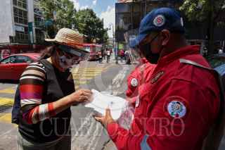 Elementos de la Coordinación Municipal de Protección Civil y Bomberos de Toluca iniciaron la campaña “No des la espalda a tu salud” saliendo a las calles a regalar cubrebocas y gel antibacterial, así como realizar algunas coreografías en distintos puntos de la ciudad invitando a la población a no bajar la guardia y decirse cuidado durante la contingencia por COVID-19. FOTO: CRISANTA ESPINOSA AGUILAR /CUARTOSCURO.COM