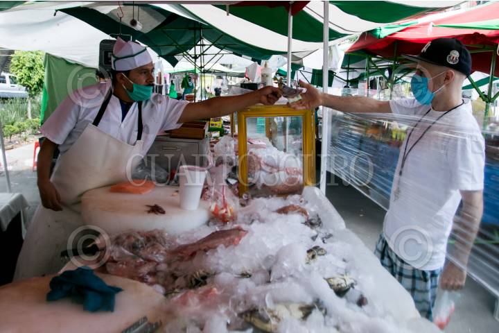 CIUDAD DE MÉXICO, 03JULIO2020.- Desde el día de ayer, los tianguis y mercados sobre ruedas reanudaron actividades, las cuales habían estado limitadas debido a la pandemia por Covid-19. Con plástico que protege el contacto directo con los productos, así como el uso de cubrebocas y gel antibacterial es que los comerciantes han podido reiniciar sus trabajos. FOTO: GALO CAÑAS /CUARTOSCURO.COM