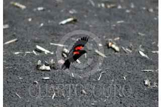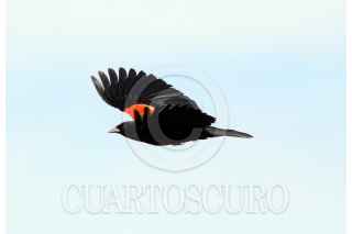 TLALTIZAPAN, MORELOS, 04JULIO2020.- Un mirlo de alas rojas o tordo sargento, (Agelaius phoeniceus) emprende el vuelo en una parcela de siembra del paraje El Charco. Los machos tienen un plumaje negro con manchas rojas y una línea amarilla en los hombros de las alas, habita zonas húmedas y terrenos de cultivo de América del Norte y Centroamérica. Es considerada el ave nativa más abundante en Norteamérica y también una plaga para los cultivos. FOTO: MARGARITO PÉREZ RETANA /CUARTOSCURO.COM