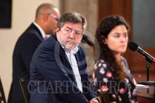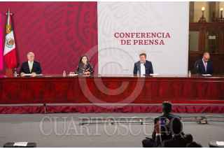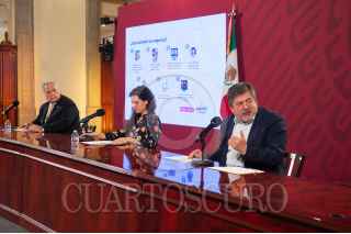 CIUDAD DE MÉXICO, 05JULIO2020.- Miguel Torruco Marqués, secretario de Turismo; Luisa María Alcalde Luján, secretaria del Trabajo y Previsión Social; Rogelio Jiménez Pons, director general del Fondo Nacional de Fomento al Turismo (Fonatur), y Carlos González González, director general de Visit México, durante la conferencia de Bienestar en Palacio Nacional. FOTO: PRESIDENCIA/CUARTOSCURO.COM