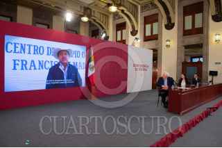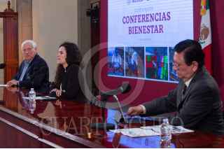 CIUDAD DE MÉXICO, 07JULIO2020.- Víctor Manuel Villalobos Arámbula, secretario de Agricultura y Desarrollo Rural; Luisa María Alcalde Luján, secretaria del Trabajo y Previsión Social, e Ignacio Ovalle Fernández, director general de Seguridad Alimentaria Mexicana (Segalmex), durante las Conferencias Bienestar en Palacio Nacional. FOTO: PRESIDENCIA/CUARTOSCURO.COM