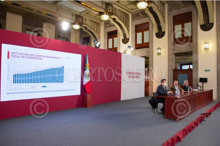 CIUDAD DE MÉXICO, 07JULIO2020.- Francisco José Quiroga Fernández, subsecretario de Minería, Secretaría de Economía; Alejandro Rosas Guerrero, jefe de la Unidad de Prospectiva, Planeación y Evaluación (SE), y Rocío Mejía Flores, coordinadora del programa Microcréditos para el Bienestar (SE), durante la conferencia de Créditos en Palacio Nacional. FOTO: PRESIDENCIA/CUARTOSCURO.COM
