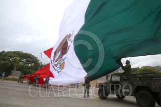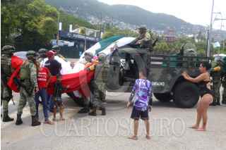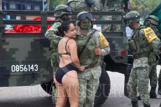 ACAPULCO, GUERRERO, 07JULIO2020.- Ante los fuertes vientos provocados por la tormenta Cristina que afecta las costas de Guerrero soldados resguardaron la bandera que se encuentra en la asta de la playa Papagayo, situación que algunas turistas aprovecharon para tomarse algunas fotos con el personal militar. FOTO: CARLOS ALBERTO CARBAJAL/CUARTOSCURO.COM
