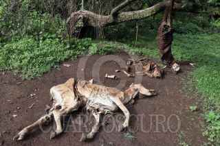 TEPOZTLÁN, MORELOS, 08JULIO2020.- Los zopilotes comen la carne putrefacta de varios cadáveres de res en el paraje conocido como “La Laguna” en la Reserva Estatal de “El Texcal”. Se desconoce la causa de muerte de varias reses, entre las que se incluye un feto; una cabeza de res, incluso, está aún atada a un árbol. FOTO: MARGARITO PÉREZ RETANA /CUARTOSCURO.COM