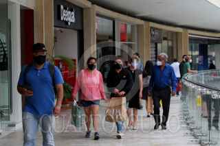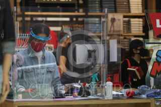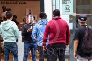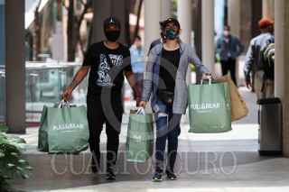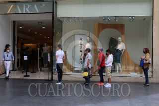 CIUDAD DE MÉXICO, 08JULIO2020.- Tras más de tres meses de cierre debido a la crisis por Covid-19, los centros comerciales reabrieron sus puertas tras la entrada en semáforo epidemiológico naranja. Armados con termómetro, gel antibacterial y cubrebocas con careta, los encargados de las tiendas comienzan a atender a un 30 por ciento de su capacidad y en un horario de 11 a 17:00 hrs. FOTO: GALO CAÑAS /CUARTOSCURO.COM