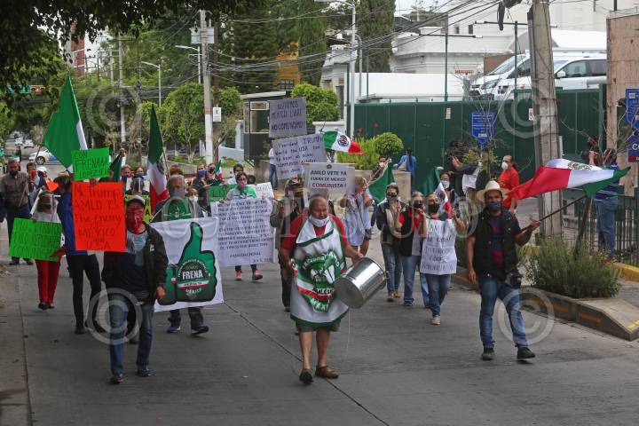 GUADALAJARA, JALISCO, 08JULIO2020.-Esta tarde un grupo de personas del Frente Nacional Anti-AMLO (FRENA) se manifestó a los alrededores del Consulado Americano de esta ciudad para protestar que el día de hoy Andrés Manuel López Obrador se reunió con su homologo el Presidente de Estados Unidos Donald Trump, ya que este ultimo no es una persona agradable para los mexicanos, a parte piden al mandatario nacional se retire de la Presidencia de la Republica, ya que según los inconformes esta destrozando al país con sus políticas publicas. FOTO: FERNANDO CARRANZA GARCIA / CUARTOSCURO.COM
