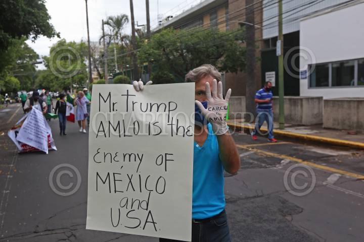 GUADALAJARA, JALISCO, 08JULIO2020.-Esta tarde un grupo de personas del Frente Nacional Anti-AMLO (FRENA) se manifestó a los alrededores del Consulado Americano de esta ciudad para protestar que el día de hoy Andrés Manuel López Obrador se reunió con su homologo el Presidente de Estados Unidos Donald Trump, ya que este ultimo no es una persona agradable para los mexicanos, a parte piden al mandatario nacional se retire de la Presidencia de la Republica, ya que según los inconformes esta destrozando al país con sus políticas publicas. FOTO: FERNANDO CARRANZA GARCIA / CUARTOSCURO.COM