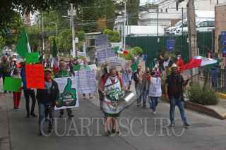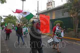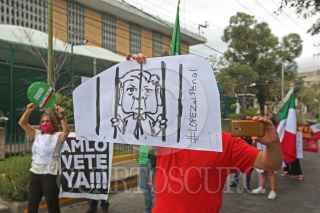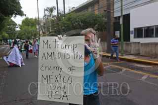 GUADALAJARA, JALISCO, 08JULIO2020.-Esta tarde un grupo de personas del Frente Nacional Anti-AMLO (FRENA) se manifestó a los alrededores del Consulado Americano de esta ciudad para protestar que el día de hoy Andrés Manuel López Obrador se reunió con su homologo el Presidente de Estados Unidos Donald Trump, ya que este ultimo no es una persona agradable para los mexicanos, a parte piden al mandatario nacional se retire de la Presidencia de la Republica, ya que según los inconformes esta destrozando al país con sus políticas publicas. FOTO: FERNANDO CARRANZA GARCIA / CUARTOSCURO.COM