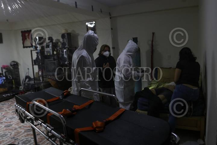 NEZAHUALCÓYOTL, ESTADO DE MÉXICO, 09JULIO2020.- Los paramédicos Emma Velázquez Velázquez de 42 años y José Enríquez Navarro de 27 años forman parte del equipo de paramédicos de la Brigada Rescate y Urgencias Médicas Nezahualcóyotl, en el cual laboran jornadas de 12 x 24 horas divididos en tres turnos. Durante su turno nocturno realizaron el servicio de verificación de un paciente con Covid-19 de 46 años, quién falleció en su casa antes de ser trasladado a un hospital. Previamente los familiares firman la autorización para poder trasladar al paciente y si fallece les informan que deben pedir el servicio funerario de inmediato. Emma y Enrique expresaron que la mayor satisfacción que sienten al realizar su trabajo es el agradecimiento de las personas y ver que su salud mejora cuando los ayudan. En el país se registran 32 796 defunciones a causa de Coronavirus y 39 108 casos confirmados en el Estado de México. FOTO: GRACIELA LÓPEZ /CUARTOSCURO.COM