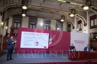 CIUDAD DE MÉXICO, 09JULIO2020.- Carlos Martínez Velázquez, director general del Instituto de Infonavit; Agustín Gustavo Rodríguez López, vocal ejecutivo de Fovissste, y Alejandro Rosas Guerrero, jefe de la Unidad de Prospectiva, Planeación y Evaluación, Secretaría de Economía, durante la conferencia de Créditos en Palacio Nacional. FOTO: PRESIDENCIA/CUARTOSCURO.COM