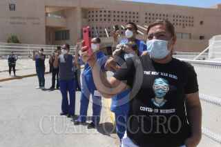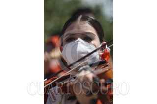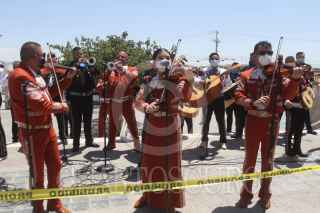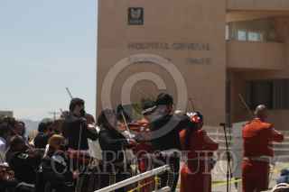CIUDAD JUÁREZ, CHIHUAHUA, 10JULIO2020.- Para agradecer por su labor al personal médico ante la pandemia por Covid-19, empresarios juarenses organizaron una serenata en la clínica 66 del Instituto Mexicano del Seguro Social (IMSS) de Ciudad Juárez. Cerca de 50 músicos juarenses entonaron varias piezas al exterior de la clínica, donde son atendidos pacientes de coronavirus. Al día de hoy suman tres mil 026 los casos positivos de COVID-19 en Ciudad Juárez y 331 los decesos, de acuerdo con el informe emitido hoy por la Secretaría de Salud de Gobierno del Estado. FOTO: NACHO RUIZ /CUARTOSCURO.COM
