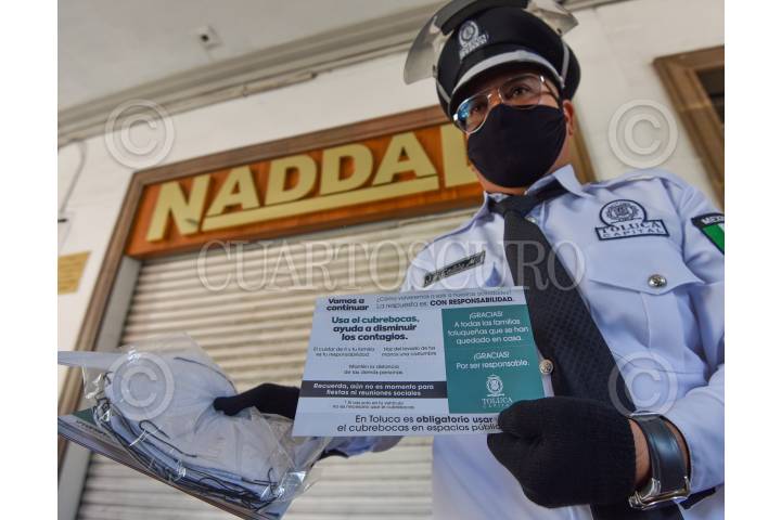 TOLUCA, ESTADO DE MÉXICO, 13JULIO2020.- Personal de PC de Toluca y policías municipales invitan a la población a utilizar cubrebocas y que sea de forma correcta, los ciudadanos que no lo porten se les proporciona uno para su uso, esto después de que fue aprobado en cabildo el uso obligatorio de mascarillas en espacios públicos y de no acatar la medida ser acreedores a una multa o arresto, como una medida de prevención ante el incremento de contagios por COVID-19. FOTO: CRISANTA ESPINOSA AGUILAR /CUARTOSCURO.COM
