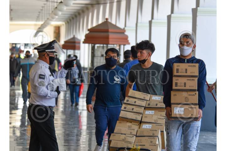 TOLUCA, ESTADO DE MÉXICO, 13JULIO2020.- Personal de PC de Toluca y policías municipales invitan a la población a utilizar cubrebocas y que sea de forma correcta, los ciudadanos que no lo porten se les proporciona uno para su uso, esto después de que fue aprobado en cabildo el uso obligatorio de mascarillas en espacios públicos y de no acatar la medida ser acreedores a una multa o arresto, como una medida de prevención ante el incremento de contagios por COVID-19. FOTO: CRISANTA ESPINOSA AGUILAR /CUARTOSCURO.COM