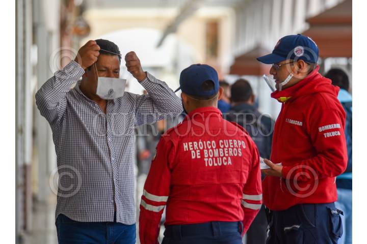 TOLUCA, ESTADO DE MÉXICO, 13JULIO2020.- Personal de PC de Toluca y policías municipales invitan a la población a utilizar cubrebocas y que sea de forma correcta, los ciudadanos que no lo porten se les proporciona uno para su uso, esto después de que fue aprobado en cabildo el uso obligatorio de mascarillas en espacios públicos y de no acatar la medida ser acreedores a una multa o arresto, como una medida de prevención ante el incremento de contagios por COVID-19. FOTO: CRISANTA ESPINOSA AGUILAR /CUARTOSCURO.COM