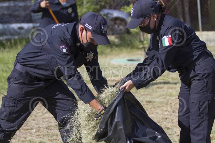 GUADALUPE, NUEVO LEÓN, 13JULIO2020.- Más de 3 mil servidores públicos del municipio de Guadalupe, incluyendo policías se sumaron a las limpiezas y deshierbe en los patios de planteles educativos públicos, ante la ausencia de clases desde el mes de marzo. FOTO: GABRIELA PÉREZ MONTIEL /CUARTOSCURO.COM