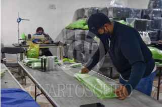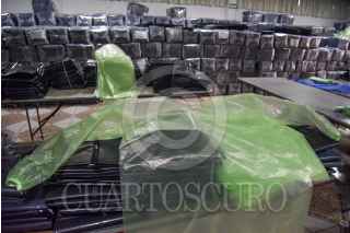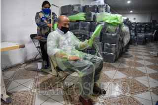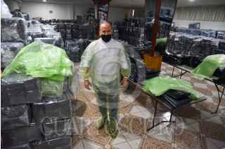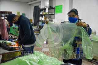 De fabricar bolsas de plástico y otros insumos la empresa Inovaplastic pasó a elaborar bolsas para muertos y ahora trajes protectores de polietileno hasta 10 veces más barato que los trajes convencionales que se usan para el contacto con pacientes con COVID-19, puede ser utilizado no solo en hospitales, también en áreas administrativas y domicilios, puede llegar a ser reutilizado hasta 5 veces y es biodegradable. El traje consta de bata, pantalón y botas, y por el precio puede acceder a él cualquier persona y poderse proteger sobre todo en el retorno a las actividades y la entrada a la “nueva normalidad”. FOTO: CRISANTA ESPINOSA AGUILAR /CUARTOSCURO.COM