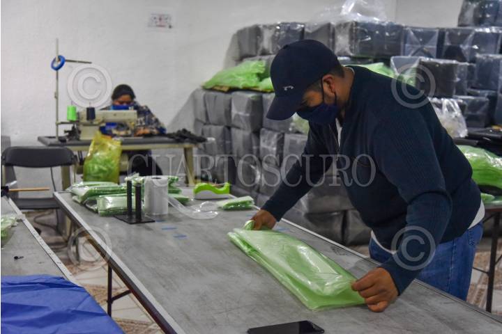 De fabricar bolsas de plástico y otros insumos la empresa Inovaplastic pasó a elaborar bolsas para muertos y ahora trajes protectores de polietileno hasta 10 veces más barato que los trajes convencionales que se usan para el contacto con pacientes con COVID-19, puede ser utilizado no solo en hospitales, también en áreas administrativas y domicilios, puede llegar a ser reutilizado hasta 5 veces y es biodegradable. El traje consta de bata, pantalón y botas, y por el precio puede acceder a él cualquier persona y poderse proteger sobre todo en el retorno a las actividades y la entrada a la “nueva normalidad”. FOTO: CRISANTA ESPINOSA AGUILAR /CUARTOSCURO.COM