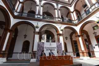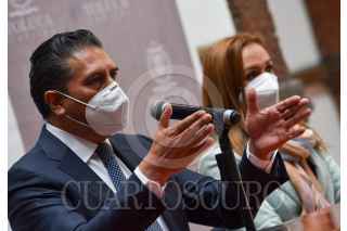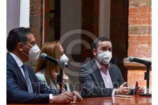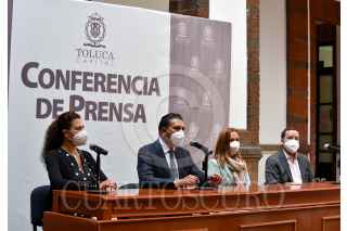 Juan Rodolfo Sánchez Gómez, presidente municipal de Toluca acompañado por Rafael Reyes Pérez Ocaña titular de NAFIN en la entidad, anunciaron créditos para pequeñas y medianas empresas, y así reiniciar y reactivar las labores económicas en el municipio paradas por la contingencia por COVID-19. FOTO: CRISANTA ESPINOSA AGUILAR /CUARTOSCURO.COM