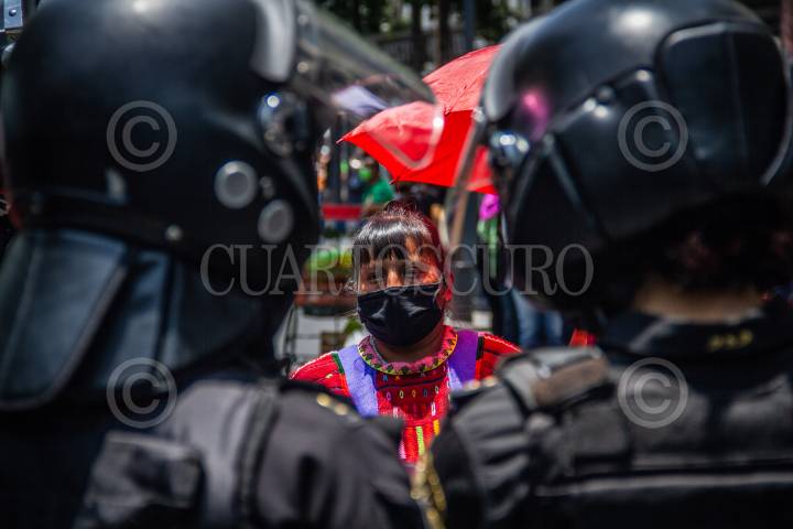 CIUDAD DE MÉXICO, 16JULIO2020.- La organización de Pueblos Artesanos Indigenas se manifestaron en el cruce de la Avenida Izazaga y Pino Suarez para exigir apoyo económico al Gobierno de la Ciudad. Elementos de seguridad rodearon las calles para evitar que los manifestantes recorrieran las calles. FOTO: ANDREA MURCIA/CUARTOSCURO.COM
