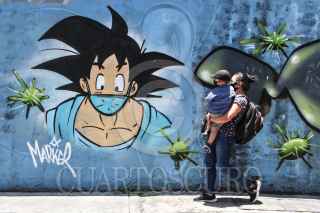 CIUDAD DE MEXICO, 17JULIO2020.- El uso de cubrebicas será permanente y obligatorio en la ciudad, esto con el objetivo de reducir los riesgos de contagios por COVId-19. Así lo aseguró la jefa de gobierno Claudia Sheinbaum. En imagen, mural del personaje de Goku, incitando a la población de la colonia el tanque para el uso de cubrebocas. FOTO: ROGELIO MORALES /CUARTOSCURO.COM