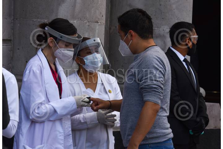 A la entrada de la Cámara de Diputados del Estado de México fue instalado un cerco en donde antes de acceder al recinto legislativo es necesario tomar la temperatura, colocar gel antibacterial, esto previo a la apertura del Tercer Periodo de Sesiones del segundo año de la LX Legislatura Local como medidas higiénicas ante la contingencia por COVID-19.FOTO: CRISANTA ESPINOSA AGUILAR /CUARTOSCURO.COM