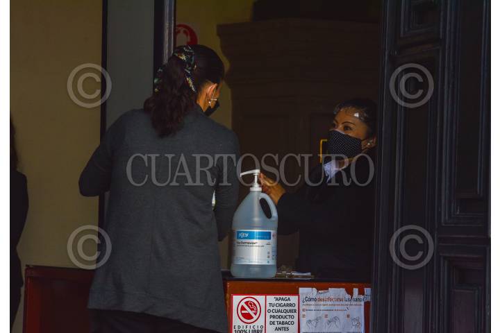 A la entrada de la Cámara de Diputados del Estado de México fue instalado un cerco en donde antes de acceder al recinto legislativo es necesario tomar la temperatura, colocar gel antibacterial, esto previo a la apertura del Tercer Periodo de Sesiones del segundo año de la LX Legislatura Local como medidas higiénicas ante la contingencia por COVID-19.FOTO: CRISANTA ESPINOSA AGUILAR /CUARTOSCURO.COM