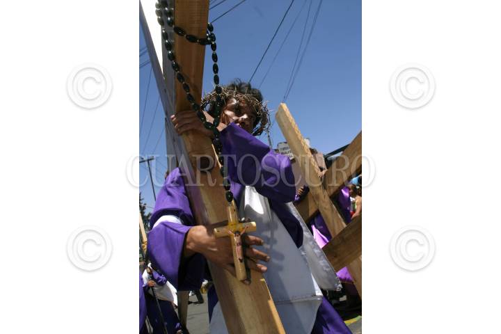 MEXICO, D.F. 14ABRIL2006.- Los llamados Nazarenos vestidos con túnicas de color morado, descalzos y cargando una cruz recorren las calles de Iztapalapa hacia el Cerro de la Estrella, ellos pagan alguna manda o promesa. FOTO: Nelly Salas/CUARTOSCURO.COM