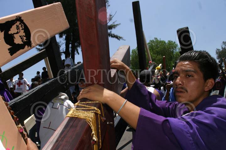 MEXICO, D.F. 14ABRIL2006.- Los llamados Nazarenos vestidos con túnicas de color morado, descalzos y cargando una cruz recorren las calles de Iztapalapa hacia el Cerro de la Estrella, ellos pagan alguna manda o promesa. FOTO: Nelly Salas/CUARTOSCURO.COM
