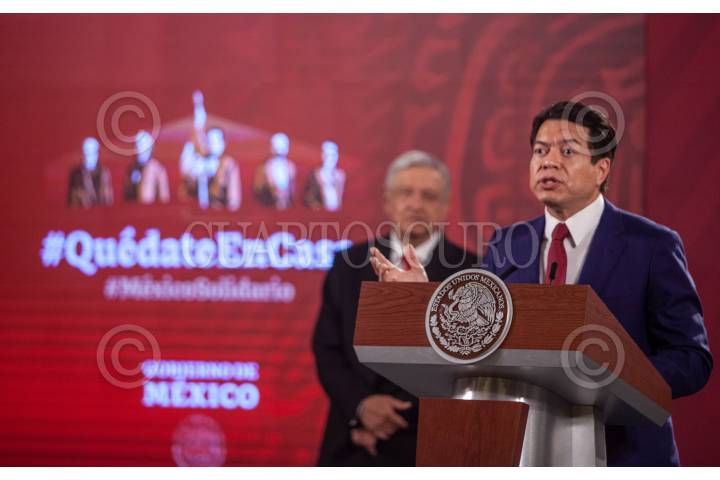 CIUDAD DE MÉXICO, 22JULIO2020.-Andrés Manuel López Obrador, presidente de México acompañado de Arturo Herrera Gutiérrez, secretario de Hacienda y crédito Público; Ricardo Monreal Ávila, presidente de la Junta de Coordinación Política de la Cámara de Senadores; Mario Delgado Carrillo, presidente de la Junta de Coordinación Política de la Cámara de Diputados; Zóe Robledo Aburto, director general del IMSS; Carlos Salazar Lomelín, Presidente del Consejo Coordinador Empresarial; Carlos Aceves del Olmo, secretario general de la Confederación de Trabajadores de México (CTM) y Julio Scherer Ibarra, consejero jurídico de la presidencia, durante la conferencia matutina en el Palacio Nacional. FOTO: ANDREA MURCIA/CUARTOSCURO.COM