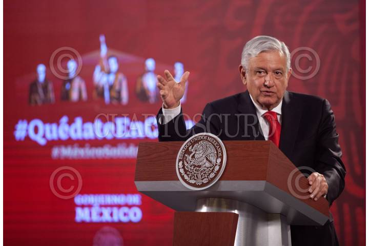 CIUDAD DE MÉXICO, 22JULIO2020.-Andrés Manuel López Obrador, presidente de México acompañado de Arturo Herrera Gutiérrez, secretario de Hacienda y crédito Público; Ricardo Monreal Ávila, presidente de la Junta de Coordinación Política de la Cámara de Senadores; Mario Delgado Carrillo, presidente de la Junta de Coordinación Política de la Cámara de Diputados; Zóe Robledo Aburto, director general del IMSS; Carlos Salazar Lomelín, Presidente del Consejo Coordinador Empresarial; Carlos Aceves del Olmo, secretario general de la Confederación de Trabajadores de México (CTM) y Julio Scherer Ibarra, consejero jurídico de la presidencia, durante la conferencia matutina en el Palacio Nacional. FOTO: ANDREA MURCIA/CUARTOSCURO.COM