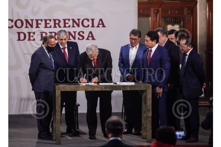 CIUDAD DE MÉXICO, 22JULIO2020.-Andrés Manuel López Obrador, presidente de México acompañado de Arturo Herrera Gutiérrez, secretario de Hacienda y crédito Público; Ricardo Monreal Ávila, presidente de la Junta de Coordinación Política de la Cámara de Senadores; Mario Delgado Carrillo, presidente de la Junta de Coordinación Política de la Cámara de Diputados; Zóe Robledo Aburto, director general del IMSS; Carlos Salazar Lomelín, Presidente del Consejo Coordinador Empresarial; Carlos Aceves del Olmo, secretario general de la Confederación de Trabajadores de México (CTM) y Julio Scherer Ibarra, consejero jurídico de la presidencia, durante la conferencia matutina en el Palacio Nacional. FOTO: ANDREA MURCIA/CUARTOSCURO.COM