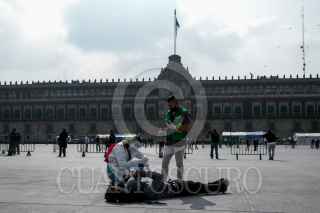 CIUDAD DE MÉXICO, 23JULIO2020.- Integrantes de la llamada “Brigada de Calle”, programa implementado por la Secretaría de Inclusión y Bienestar Social (Sibiso)para prevenir contagios de Covid-19 entre las personas en situación de calle, toman los datos y conversan con un hombre que dormía en la plancha del Zócalo. FOTO: GALO CAÑAS /CUARTOSCURO.COM