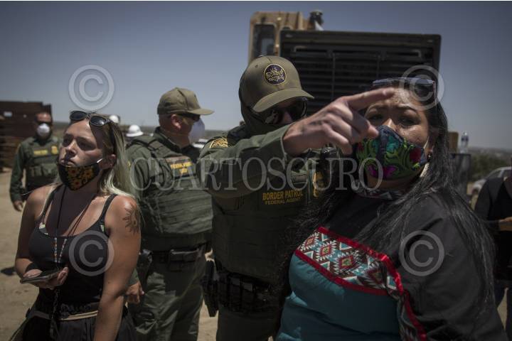 TECATE, BAJA CALIFORNIA, 23JULIO2020.- Miembros de la comunidad Kumiai de Tijuana, Tecate y San Diego se reunieron con el objetivo de realizar rituales y ceremonias propias de su cultura para protestar por la construcción del muro fronterizo debido a que los trabajos se encuentran sobre zonas sagradas para ellos, pues ahí se encuentran enterrados sus ancestros, y dicen que esta zona pertenecía a ellos desde hace milenios. Ahora con el muro fronterizo se verá limitado su libre transito por el lugar. Los Kumiai es la comunidad indígena más grande de la zona de Baja California y San Diego. FOTO: OMAR MARTÍNEZ /CUARTOSCURO.COM