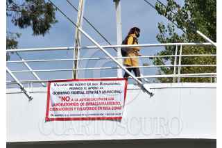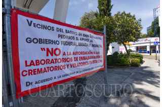 Vecinos del Barrio de San Bernardino en Toluca colocaron mantas pidiendo a las autoridades federales, estatales y municipales no se autorice la la operación de laboratorios de embalsamamiento, crematorios y velatorios en esa zona, han denunciado que son objeto de amenazas al estar en contra de estos negocios. FOTO: CRISANTA ESPINOSA AGUILAR /CUARTOSCURO.COM