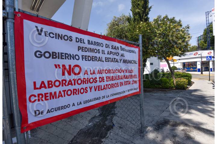 Vecinos del Barrio de San Bernardino en Toluca colocaron mantas pidiendo a las autoridades federales, estatales y municipales no se autorice la la operación de laboratorios de embalsamamiento, crematorios y velatorios en esa zona, han denunciado que son objeto de amenazas al estar en contra de estos negocios. FOTO: CRISANTA ESPINOSA AGUILAR /CUARTOSCURO.COM