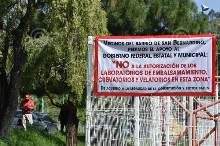 Vecinos del Barrio de San Bernardino en Toluca colocaron mantas pidiendo a las autoridades federales, estatales y municipales no se autorice la la operación de laboratorios de embalsamamiento, crematorios y velatorios en esa zona, han denunciado que son objeto de amenazas al estar en contra de estos negocios. FOTO: CRISANTA ESPINOSA AGUILAR /CUARTOSCURO.COM