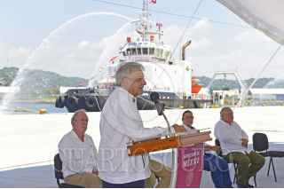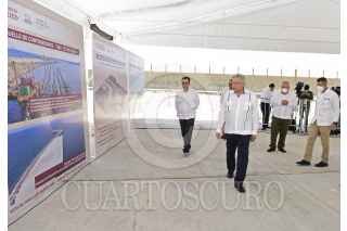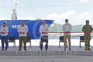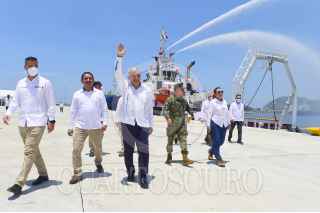 SALINA CRUZ, OAXACA, 25JULIO2020.- Andrés Manuel López Obrador, presidente de México, realizó un recorrido por los trabajos de modernización del puerto de Salina Cruz en la Administración Portuaria Integral. Donde estuvo acompañado por Leonardo Deutsch Espino, jefe de la Unidad de Infraestructura y Transportes del Corredor Interoceánico del Istmo de Tehuantepec; Octavio Romero Oropeza, Director de PEMEX; Rocío Nahle García, Secretaria de Energía; Rafael Marín Mollinedo, Director General del Corredor Interoceánico del Istmo de Tehuantepec; Alejandro Murat Hinojosa, Gobernador de Oaxaca; Almirante José Rafael Ojeda Durán, Secretario de Marina; Jesús Ramírez Cuevas, Coordinador General de Comunicación Social y Vocero del Gobierno de México; Roberto Alfredo Mendoza Sánchez, Director General de la Administración Portuaria Integral de Salina Cruz, Oaxaca y Juan Carlos Atecas Altamirano, presidente municipal Constitucional de Salina Cruz, Oaxaca. Foto: FOTO: PRESIDENCIA /CUARTOSCURO.COM