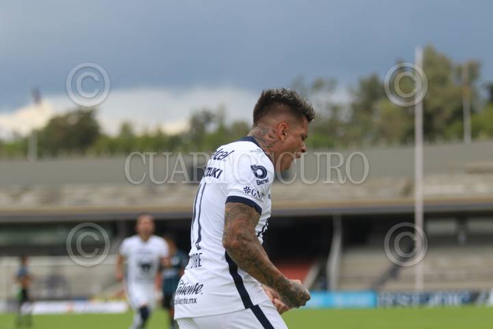 CIUDAD DE MÉXICO, 26JULIO2020.- Los Pumas inician el torneo en contra del Querétaro en el Estadio Olímpico Universitario, de la Liga MX bautizada como Guard1anes, cuyo arranque ha sido sin afición en cumplimiento de las medidas sanitarias por la pandemia de Covid-19. Los felinos lograron una victoria de 3-2, sus anotaciones estuvieron a cargo de un doblete de Juan Ignacio Dinenno y de un disparo de Juan Manuel Iturbe que rebotó en un contrario clavandose en la portería. FOTO: MOISÉS PABLO/CUARTOSCURO.COM
