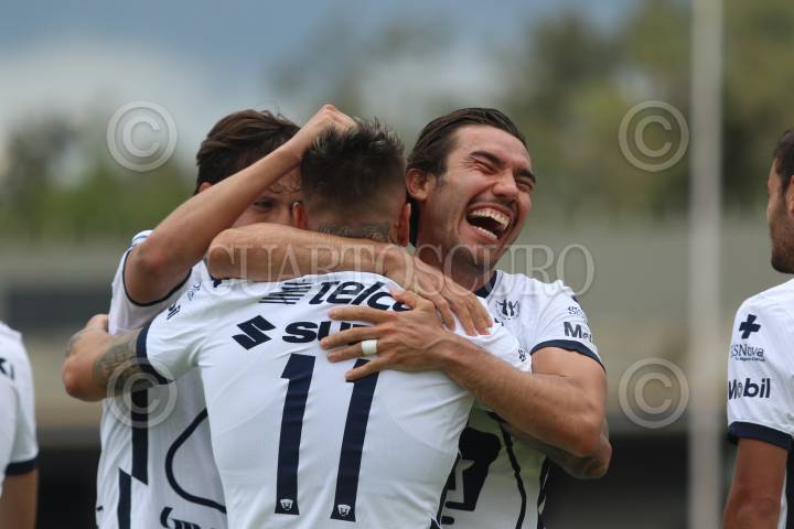 CIUDAD DE MÉXICO, 26JULIO2020.- Los Pumas inician el torneo en contra del Querétaro en el Estadio Olímpico Universitario, de la Liga MX bautizada como Guard1anes, cuyo arranque ha sido sin afición en cumplimiento de las medidas sanitarias por la pandemia de Covid-19. Los felinos lograron una victoria de 3-2, sus anotaciones estuvieron a cargo de un doblete de Juan Ignacio Dinenno y de un disparo de Juan Manuel Iturbe que rebotó en un contrario clavandose en la portería. FOTO: MOISÉS PABLO/CUARTOSCURO.COM