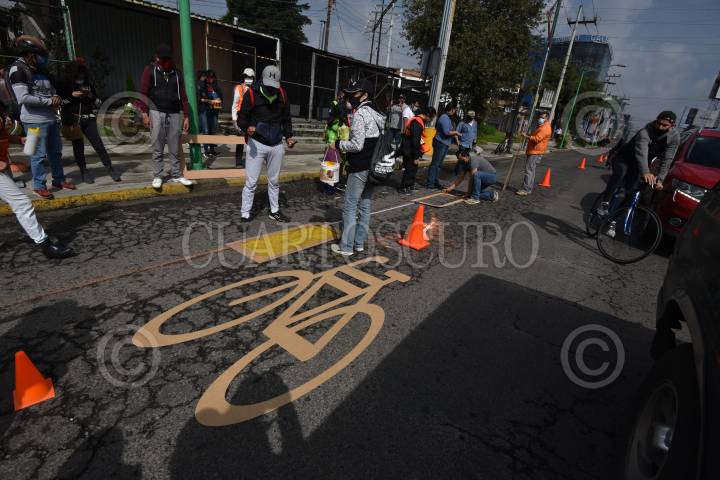 Integrantes del colectivo Movilidad para Todos realizaron la pinta de ciclovías emergentes en la avenida 5 de Mayo y Solidaridad Las Torres en la ciudad de Toluca, como una alternativa de movilidad segura en tiempos de COVID-19 y evitar que suba el número de contagios, estas pintas son una forma de presionarle a las autopases estatales y locales para que se realicen acciones que fomenten el uso de la bicicleta y seguridad para los ciclistas. FOTO: CRISANTA ESPINOSA AGUILAR / CUARTOSCURO.CON
