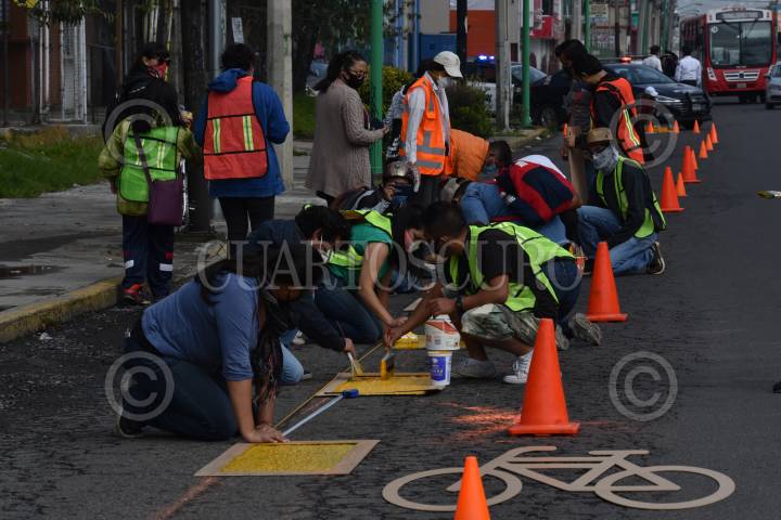 Integrantes del colectivo Movilidad para Todos realizaron la pinta de ciclovías emergentes en la avenida 5 de Mayo y Solidaridad Las Torres en la ciudad de Toluca, como una alternativa de movilidad segura en tiempos de COVID-19 y evitar que suba el número de contagios, estas pintas son una forma de presionarle a las autopases estatales y locales para que se realicen acciones que fomenten el uso de la bicicleta y seguridad para los ciclistas. FOTO: CRISANTA ESPINOSA AGUILAR / CUARTOSCURO.CON