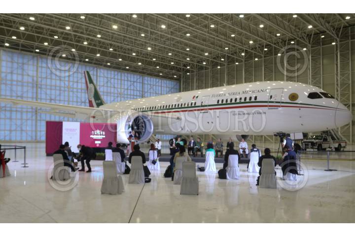 CIUDAD DE MÉXICO, 27JULIO2020.- Andrés Manuel López Obrador, presidente de México, ofreció su conferencia mañanera en donde presentó nuevamente el Avión Presidencial José María Morelos y Pavón. El acto se realizó en el 6/o Grupo Aéreo, en la Zona Federal de Hangares en el Aeropuerto Internacional de la Ciudad de México (AICM). FOTO: GRACIELA LÓPEZ /CUARTOSCURO.COM