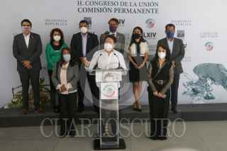CIUDAD DE MÉXICO, 28JULIO2020.- El diputado Mario Delgado, coordinador de la bancada de Morena, acompañado de Dolores Padierna, vicepresidenta de la mesa directiva de la Cámara de Diputados, durante una conferencia de prensa en el Patio del Federalismo. FOTO: GRACIELA LÓPEZ /CUARTOSCURO.COM