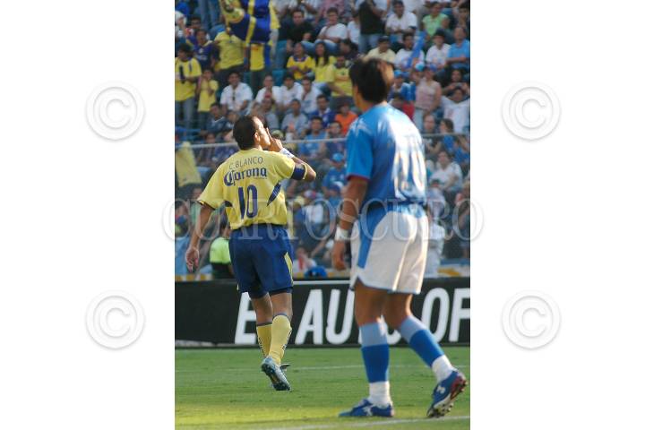 MÉXICO, D.F. 15ABRIL2006.- Aarón Padilla festeja el segundo gol de equipo en el partido de la continuación de la jornada 15 del torneo de clausura 2006 en el que las Águilas del América vencieron 3 goles a 1 a la máquina celeste de la Cruz Azul en el estadio Azul. FOTO: Iván Stephens/CUARTOSCURO.COM